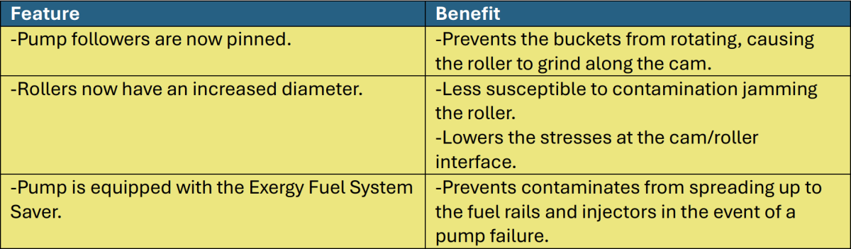 - Pump followers are now pinned which prevents the buckets from rotating, causing the roller to grind along the cam.