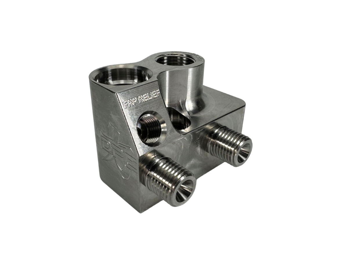 Until now, LB7s with aftermarket 3" y bridges could not fit a factory or aftermarket LB7 relief valves. Aftermarket 3" y bridge necks interfere with the banjo style reliefs forcing the end user to use a plug in the port instead. Running a plug instead of a relief can potentially damage the motor and injectors during rail pressure spikes. The DP Customs LB7 Fuel Distribution Block relocates the relief port to a vertical position and converts the system to utilize the 04.5-10 LLY/LBZ/LMM style instead. The 04.5-10 LLY/LBZ/LMM relief/plug is more compact, more affordable, and more readily available. When the relief valve pops off, the bleed off fuel flows through a -4 ORB style hole and can be routed back into the return line plumbing. Various pressure rated reliefs are available for purchase separately or included in kit.